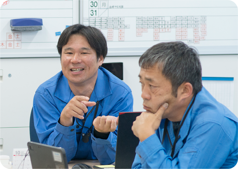 現場では個々に動いていますが、朝や夕方に事務所で顔を合わせると、笑い声が飛び交うような、明るくにぎやかな雰囲気です。