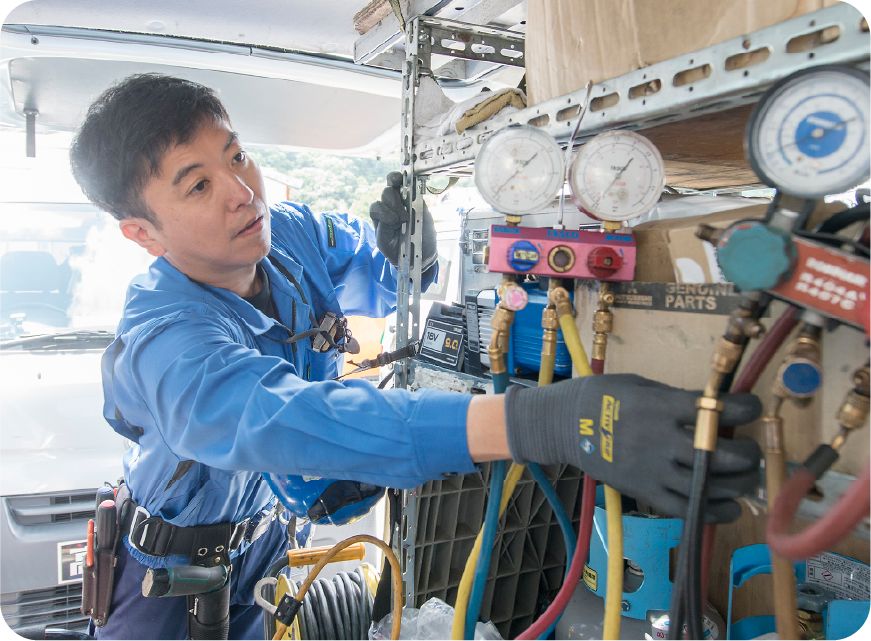とにかく“経験できること”が多い会社です。エアコン以外にも様々な機器を扱っているので、依頼も多い。おかげで、豊富な症例を経験でき、技術・知識が身に付きます。現場ごとに状況が異なる中で原因を探り、お客様に喜んでいただけることにやりがいを感じます。